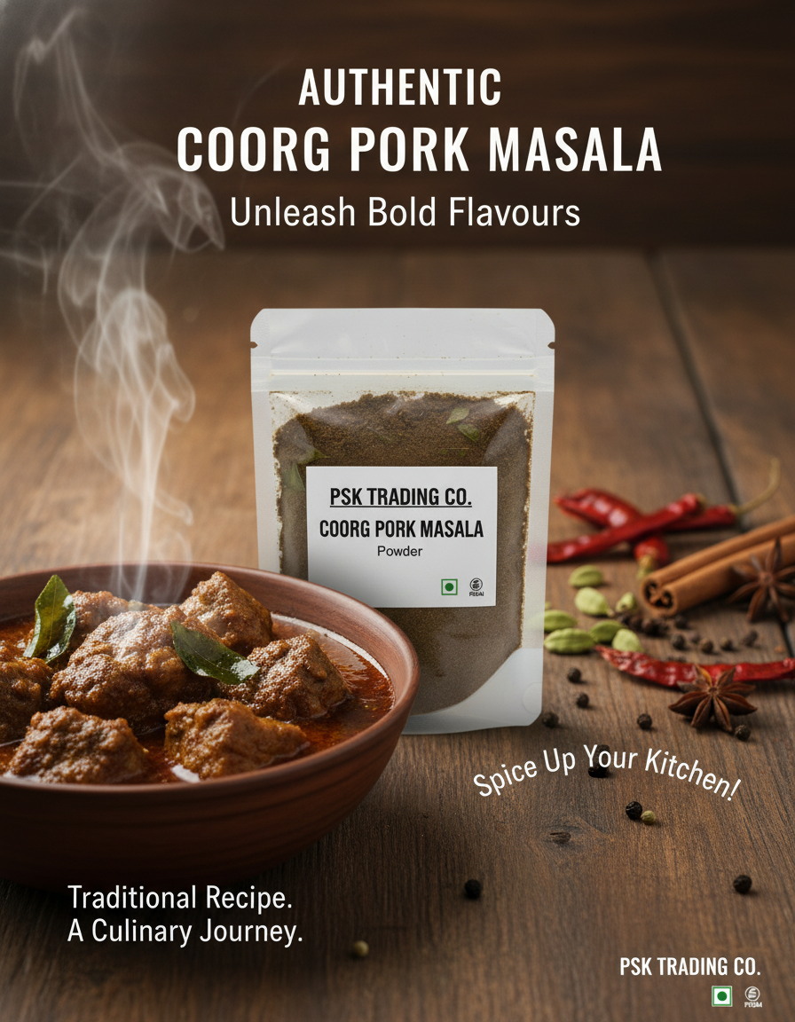 Perfect for Traditional & Modern Recipes * Authentic Coorg Pandi Curry * Spicy pork gravies and roasts * Slow-cooked pork dishes * Fusion pork recipes with Coorg flavours This masala is versatile and can be adjusted to suit mild to spicy preferences without losing its traditional character.